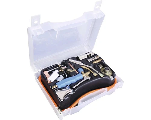 | Meegeleverd worden | 1x turbo soldeerbrander Ø 27 mm, 1x brander Ø 36 mm, 1x brander Ø 20 mm, 1x fijnsoldeerbrander Ø 14 mm, 1x opzetstuk met koperstuk 230 g, 1x opzetstuk met koperstuk 100 g, 1x breedbrander, 1x handgreep met spaarvlamhendel, 1x drukregelaar 2,5 bar, 1x gasslang 2 m 3/8", 1x piëzo-gasontsteker, 1x branderaanvoerleiding 30°, 1x houder , 2x montagesleutel, 1x kunststofkoffer |